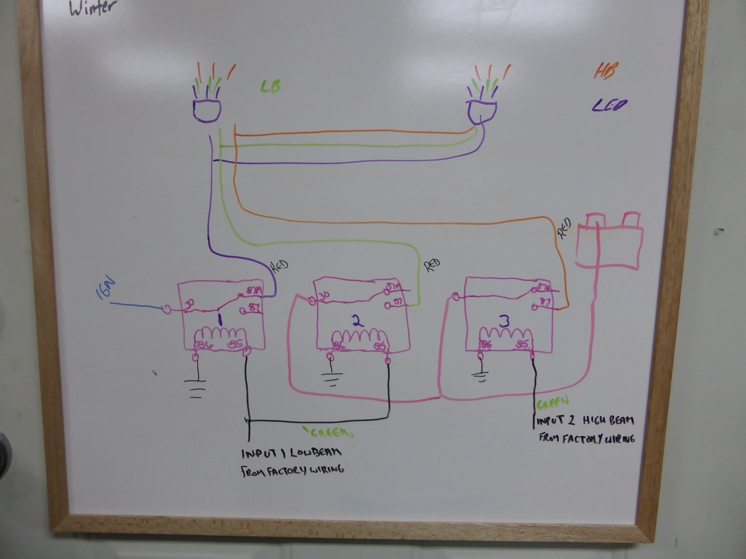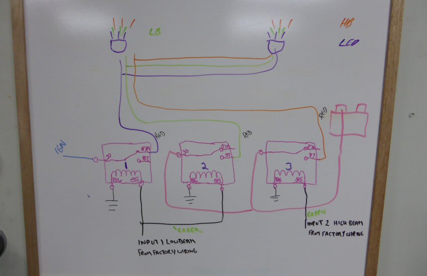 When HIGH beams/Relay #3 is engaged, power going to the trigger wire on Relay #1 turns off, thus switching the Relay #1 back into 'Normally Closed' mode turning back on the LEDs. So, the LEDs come out alongside the HIGH BEAMS. To keep the LEDs off with the HIGH Beams, you would need to install diodes in the trigger wires (GREEN) on Relay #1 & #2 to prevent the power from back feeding into Relays #1 & #2/other circuits. I left the LEDs on with the HIGH beams, as the idea with HIGH beams is to have the MOST amount of light possible. |