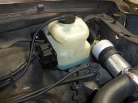 I made a small bracket which bolts to the fender and is located just behind the Washer Fluid bottle. This also allowed me to better hide the nest of wiring for a cleaner look and also avoid possible issues when washing the car.