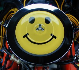 It's back and thanks to my friend Kyle for donating his old chrome lid. I have created, yet another 'Smiley Face' Air Cleaner. This lid turned out better then expected and it is now being sported on the car. (Some people are worried about me!...) |