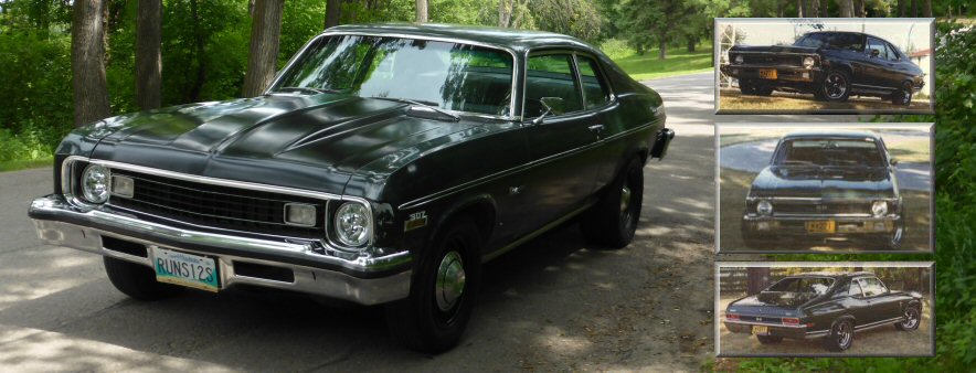 This is my 1973 Nova Custom, originally purchased new by my father in 1973 after selling his 70 Nova SS. The 73 Chevy Nova ordered with the 'Custom' package in 'Midnight Green', powered by an L65 350-2bbl, TH350 transmission and 8.5 - 2:73 Posi Rear End, rolling on Moon dish hubcaps on steel rims. Black interior, bench seats and the AM radio with optional rear speaker.